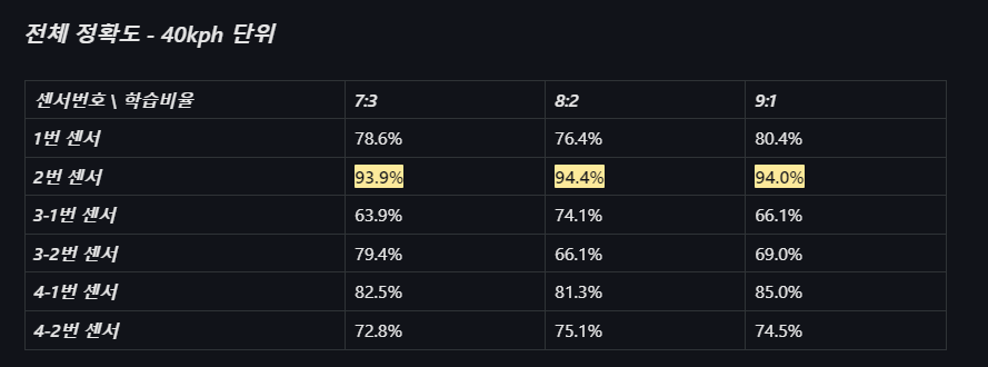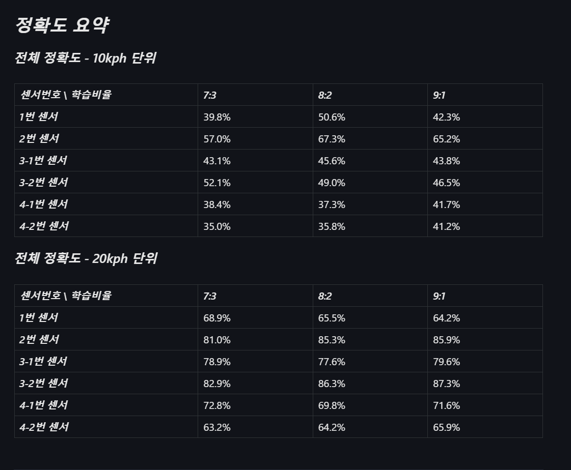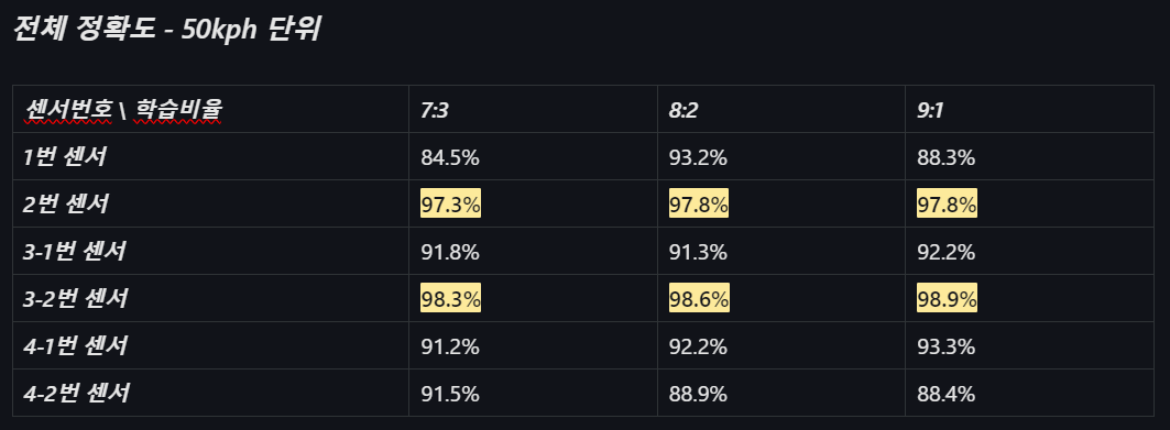 모든 센서의 전체 정확도가 80~90% 대로 상승하였고, 그 중 2번, 3-2번 센서는 97~98% 대의 정확도를 보였습니다.