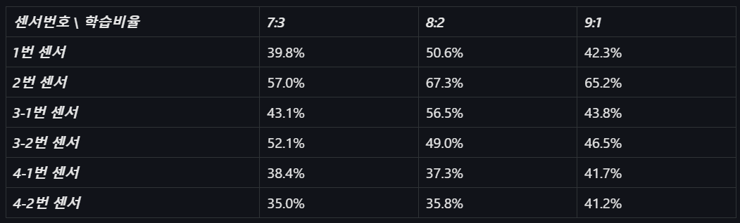 - 1~6번 센서에 대해 + 학습비율이 9:1 아닌 8:2, 7:3에 대해